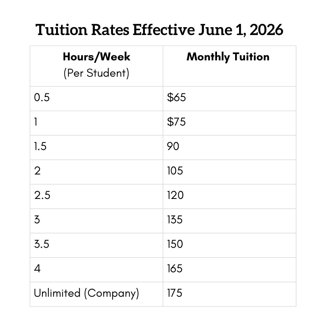 *One exception to the chart above, students taking multiple Creative Movement classes/week. 1st class is $65 and additional classes are $35.